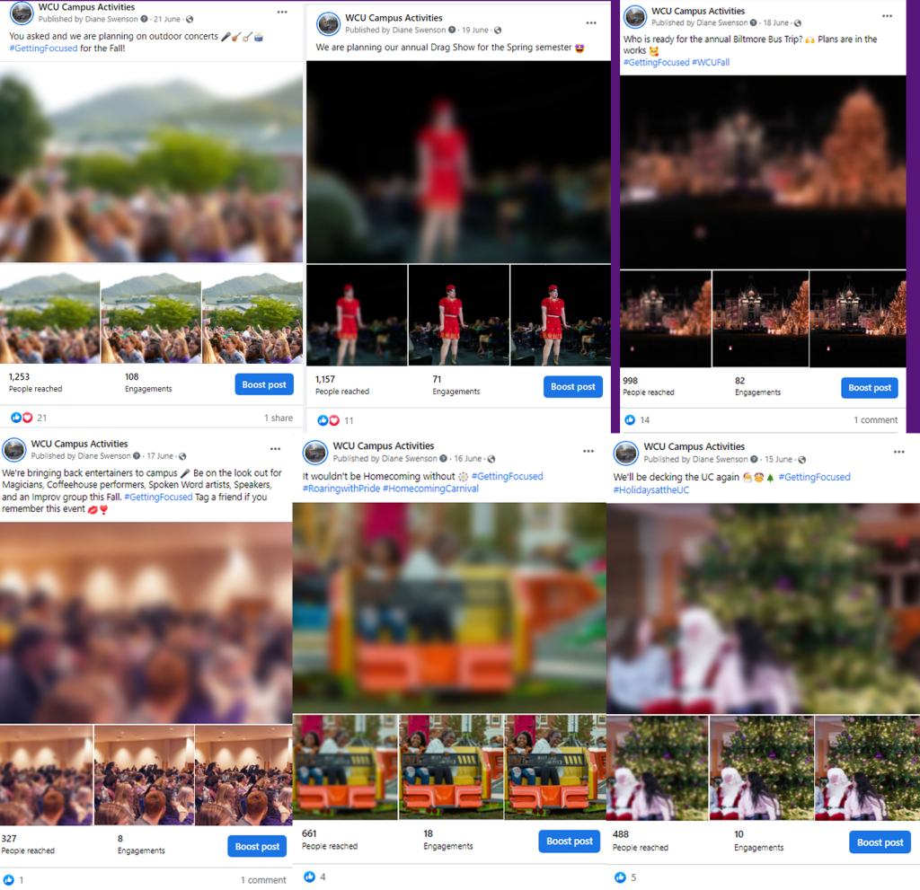 The “Getting into Focus” campaign highlighted programs that the Department of Campus Activities would be bringing back to campus after COVID restrictions had been listed. While the campaign’s engagement started low, it grew after each posting. Placements for this campaign was on WCU Campus Activities Facebook and Instagram pages.